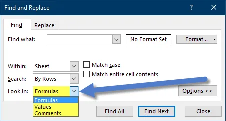 - Specify What to Find: In the dialog box, select “Formulas.” You can refine your search by checking options for: