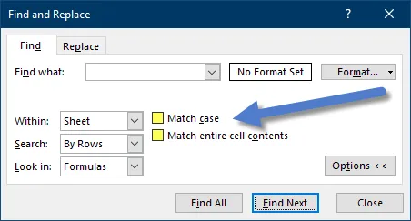 - Match entire cell contents: Finds cells that exactly match your search, excluding cells with additional text.
