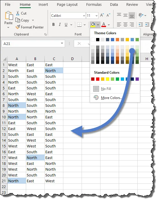 An easy way to determine the original search color is to select an existing cell with the light blue fill color and select the down arrow next to the “Fill Color” button and select “More Colors…”.
