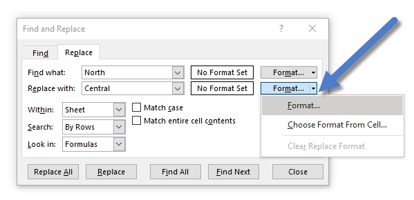 - Click the down arrow next to “Format” under “Replace with”.