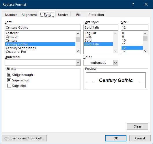 - This opens the Replace Format dialog box, which offers the same options as the Format Cells dialog box.