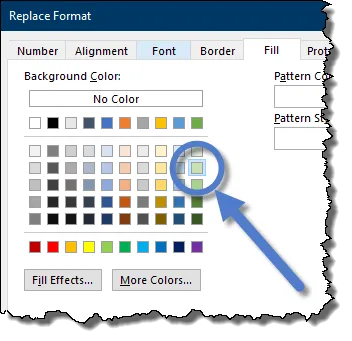 - In the Replace Format dialog, go to the Fill tab and choose a light green color or use “More Colors…” to customize.