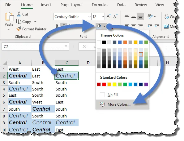 Select the Fill tab and then click the “More Colors” button to access the fill color pallet.