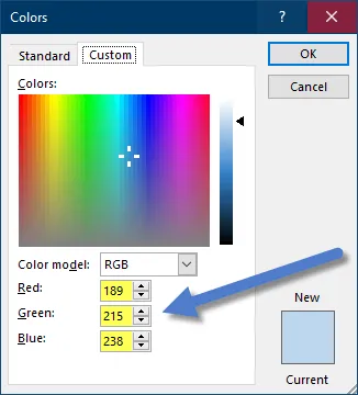 In the Colors dialog box, select the “Custom” tab and record the values located in the “Red”, “Green”, and “Blue” fields.