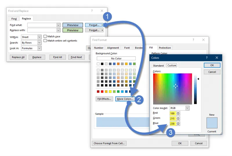 Changing cell colors using Excel’s Find and Replace tool can be straightforward. Here’s how to replace, for example, all light blue cells with light green: