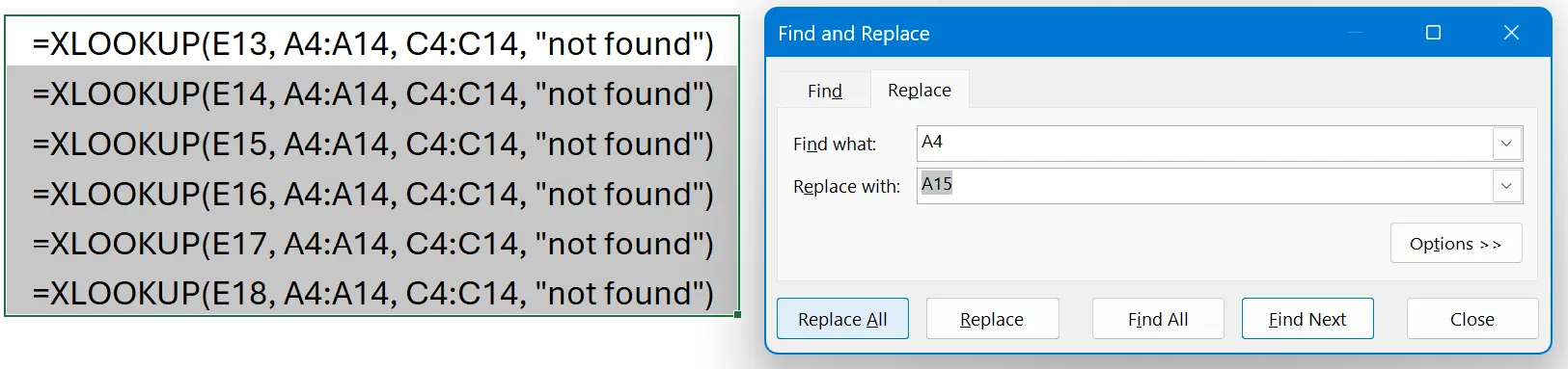 - Enter A15 in the “Replace with” field (the new reference).