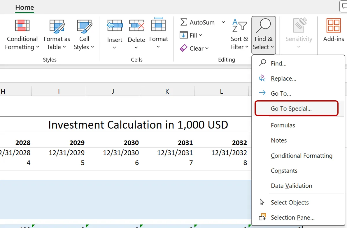 - Open Go to Special: Click “Home,” then “Find & Select,” and choose “Go To Special.” Alternatively, press F5 and select “Special…” from the dialog box.