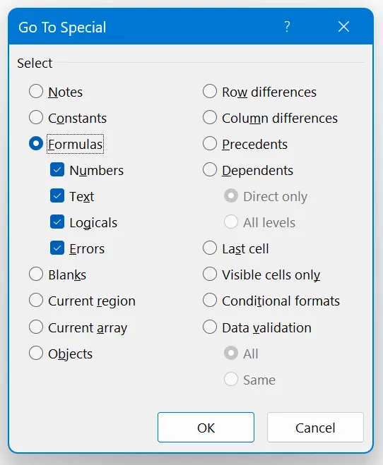 💡 For a quick overview of all cells that contain formulas, regardless of type or result, simply choose “Formulas” from the “Go to Special” menu.