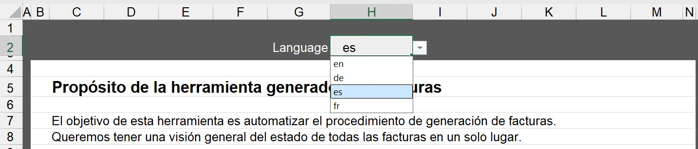 This way, changing the dropdown value in H2 will automatically update the translations for all the cells where you apply this formula.