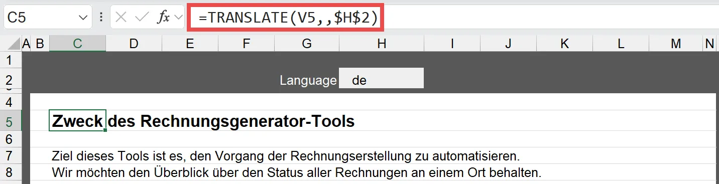 =TRANSLATE(V5, "en", $H$2)💡 The dollar signs ($) are necessary to lock the reference to the dropdown in cell H2. This way, when you drag the formula down, the reference to H2 stays the same while the V5 reference changes.