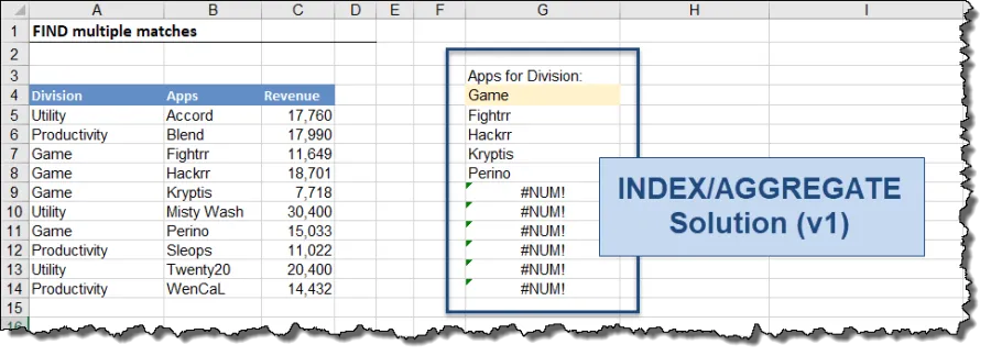=INDEX($B$5:$B$14,AGGREGATE(15,3,(($A$5:$A$14=$G$4)/($A$5:$A$14=$G$4)*ROW($A$5:$A$14))-ROW($A$4), ROWS($F$5:F5)))Fill the formula down through cells G5:G14. We now have the list of associated Apps to the selected Division as well as errors for when our return list is shorter than our expected maximum list length.