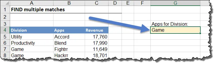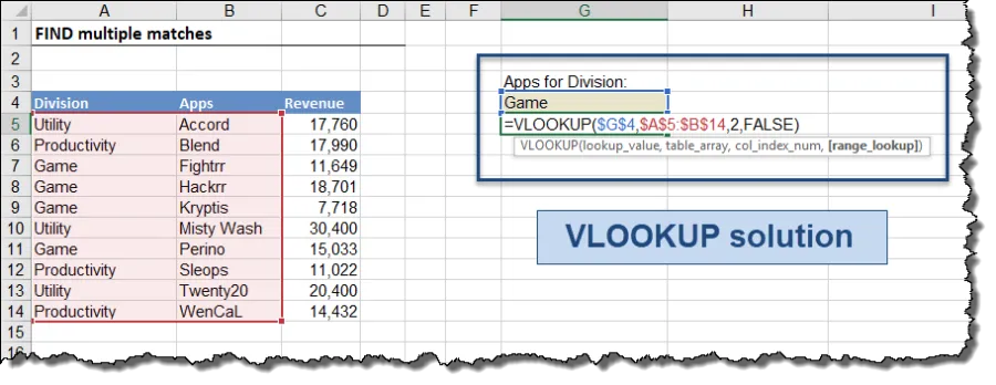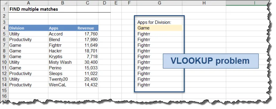 The problem with using VLOOKUP in this scenario is that VLOOKUP will always stop on the first encountered matching item in the search list. If we are searching for “Game”, the VLOOKUP will always stop in cell A7.