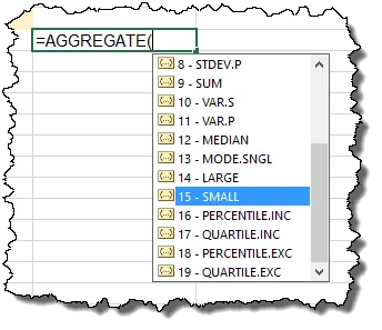 It’s now time to loop back and utilize the [k] option (the 4th parameter) of the AGGREGATE function. We want the SMALL function to increment by one for each copy of the AGGREGATE function. This will be accomplished by a cleaver trick of counting the cells in an ever-increasing range selection.