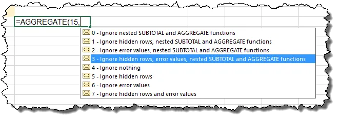 - Options = a number corresponding to a behavior for handling errors, hidden data, and other AGGREGATE and SUBTOTAL functions when mixed with data.