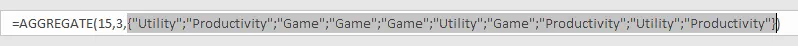 =AGGREGATE(15,3,$A$5:$A$14)If we highlight the array parameter and press F9, we will see that the supplied array returns the words located in cells A5:A14.