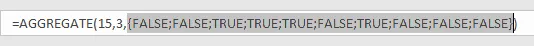 =AGGREGATE(15,3,($A$5:$A$14=$G$4))If we highlight the array parameter and press F9, we will see the following test results.