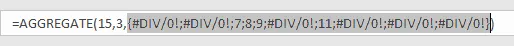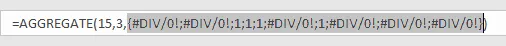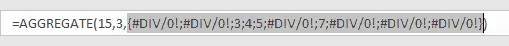 =AGGREGATE(15,3,(($A$5:$A$14=$G$4)/($A$5:$A$14=$G$4)))Because 0 ÷ 0 = ERROR and 1 ÷ 1 = 1, we get the following list of responses.