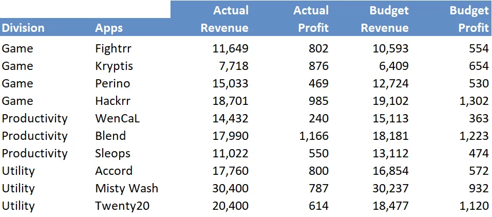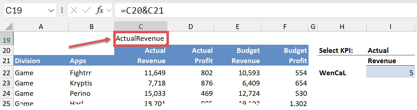Combine your criteria (Actual/Budget and Revenue/Profit) using the ampersand (&) symbol. Use a helper cell (C19) to combine the criteria: