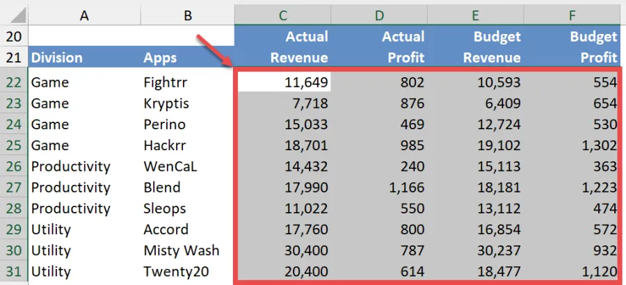 First, identify the data range that contains the values you need. In this example, we use the range C22:F31.