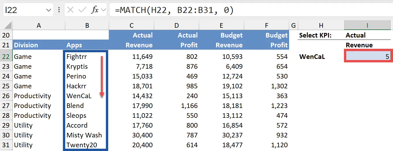 Use the MATCH function to find the row. For example, to match the app name in H22 with the list of apps in B22:B31: