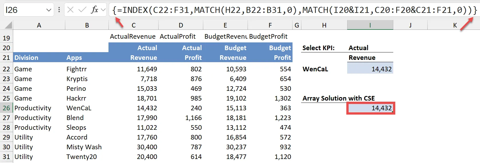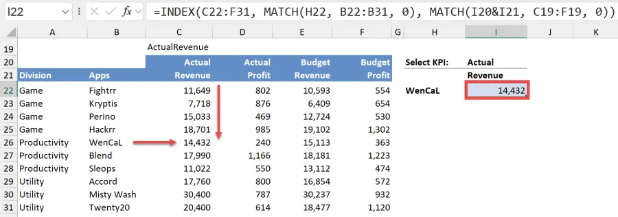 =INDEX(C22:F31, MATCH(H22, B22:B31, 0), MATCH(I20&I21, C20:F20&C21:F21, 0))- Instead of pressing ENTER, press Ctrl + Shift + Enter to enter the formula as an array formula. This tells Excel to treat the formula as an array, allowing it to handle multiple criteria.