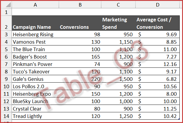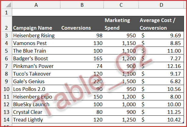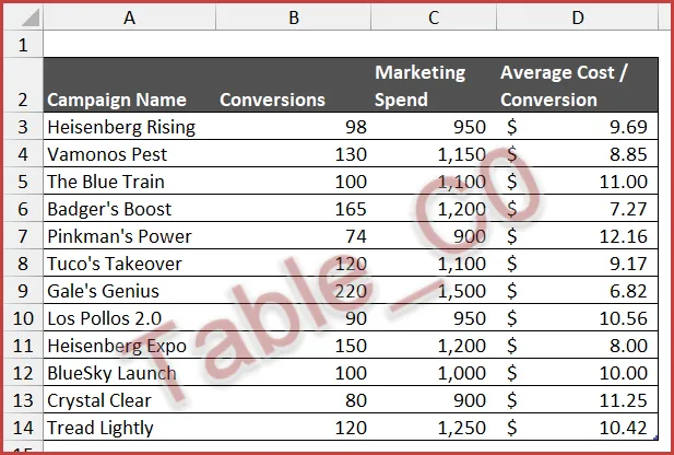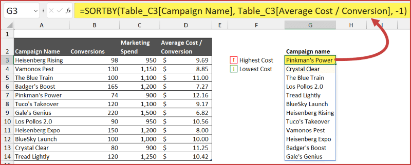 Begin by using the SORTBY function to sort the [Campaign Name] column in descending order by the [Average Cost / Conversion] column’s values.