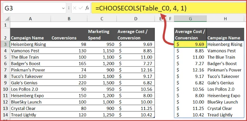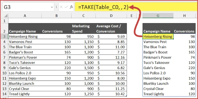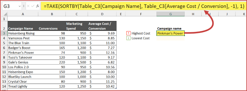 In this example, we will use Excel’s TAKE function to list the highest and lowest-cost marketing campaigns using a single formula.