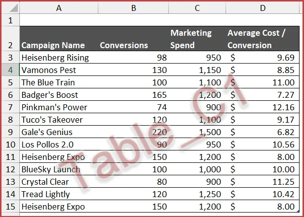 =SORTBY(Table_C3[Campaign Name], Table_C3[Average Cost / Conversion], -1)
