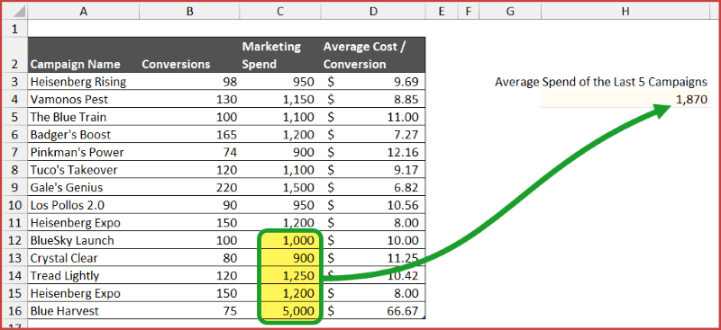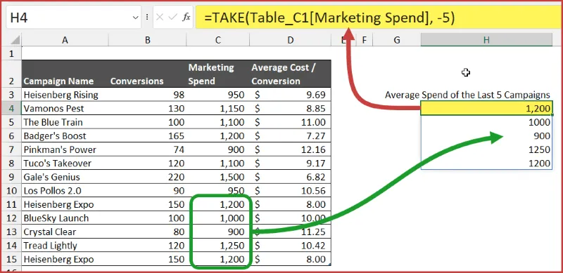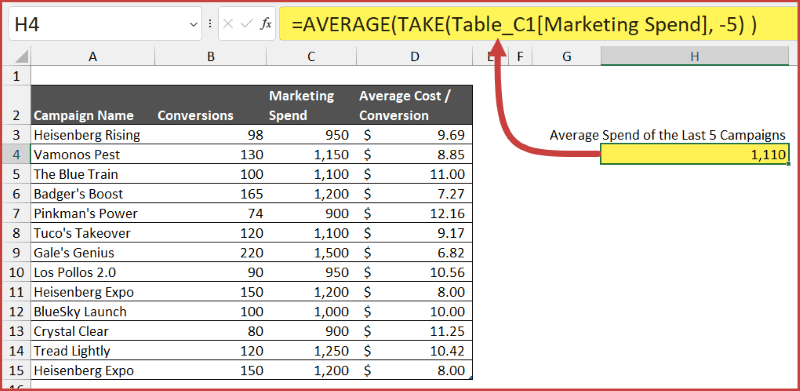 In this example, we will use Excel’s TAKE function to calculate the average spend of the last 5 marketing campaigns.