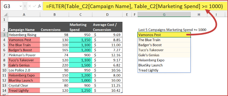 =FILTER(Table_C2[Campaign Name], Table_C2[Marketing Spend] >= 1000)