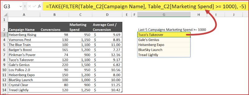 In this example, we will use Excel’s TAKE function to list the names of the last 5 marketing campaigns that spent over $1,000.