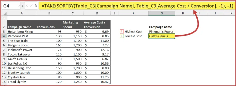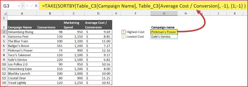 =TAKE(SORTBY(Table_C3[Campaign Name], Table_C3[Average Cost / Conversion], -1), {1, -1} )