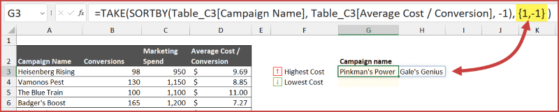 =TAKE(SORTBY(Table_C3[Campaign Name], Table_C3[Average Cost / Conversion], -1), {1; -1} )