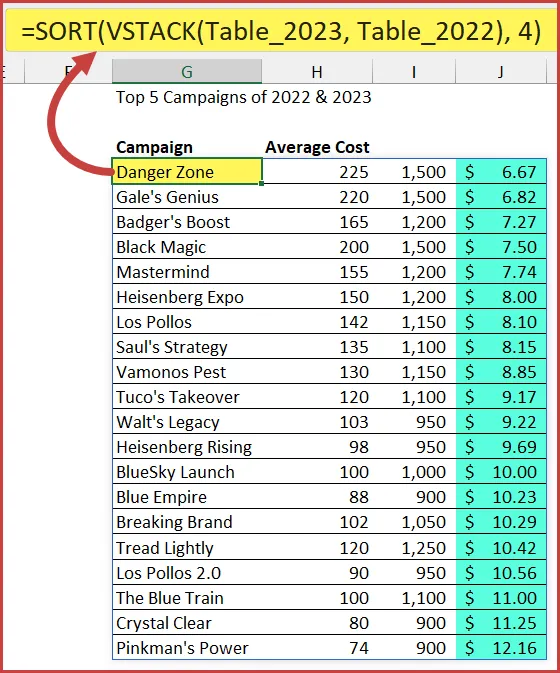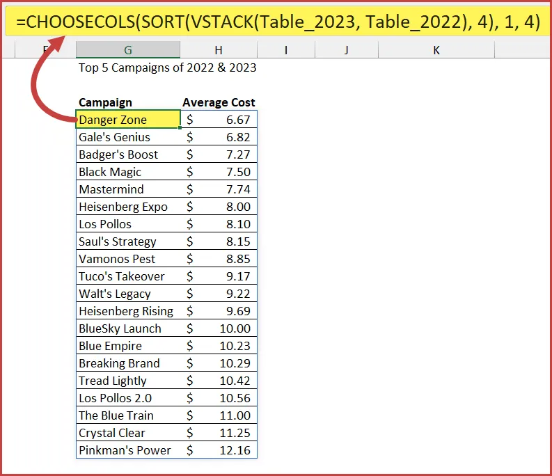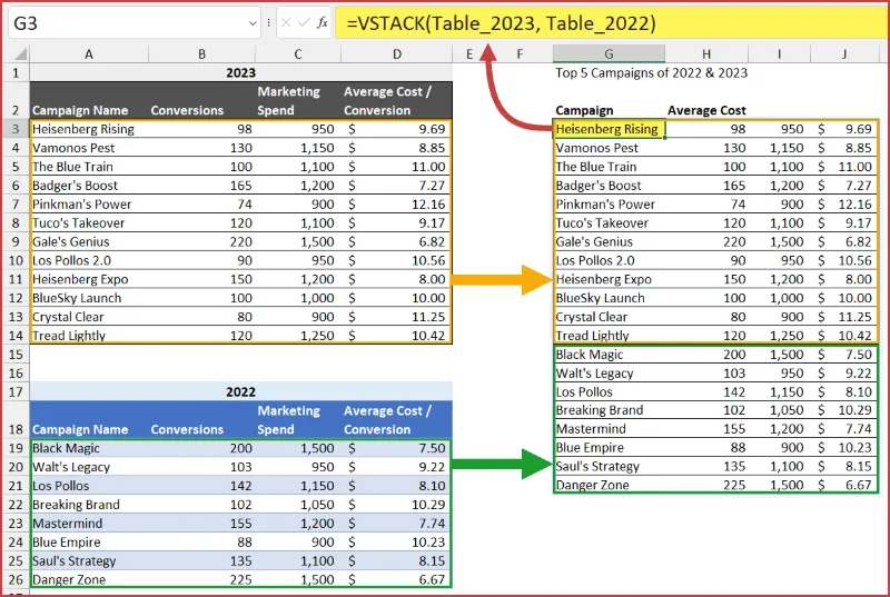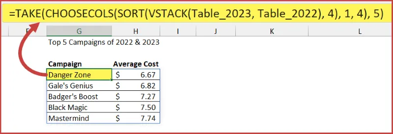 Our final example will use Excel’s TAKE function to list the top 5 marketing campaigns by average cost over two years. The data will be combined from two separate tables named “Table_2022” and “Table_2023”.