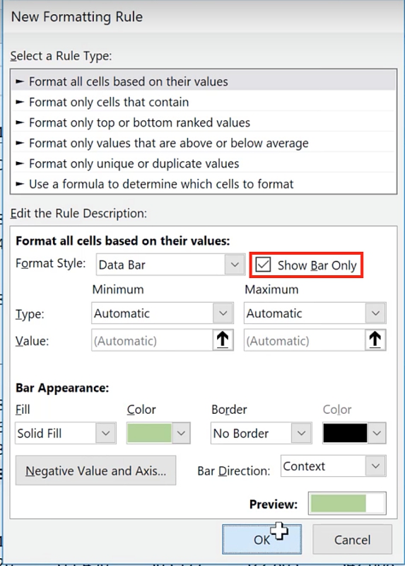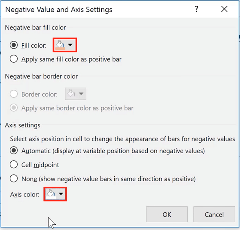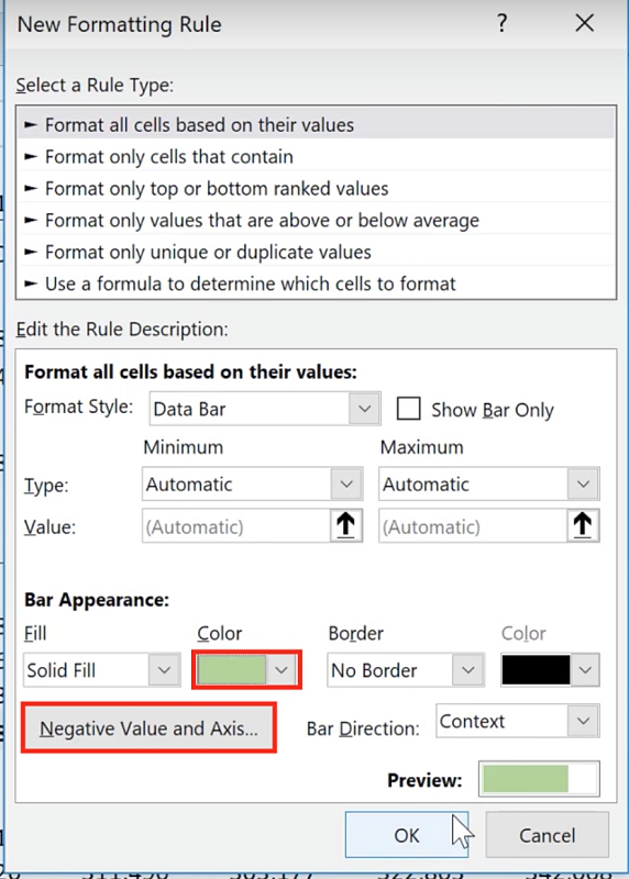 In the New Formatting Rule window you will be asked to specify the appearance of the bars, including the colors of the positive and negative values. To change the color of the positive value, change the color under the Bar Appearance section. For the negative value, click the Negative Value and Axis button.