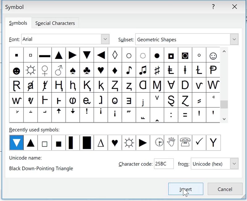 In this example, I used the Geometric Shapes subset of the Arial font.