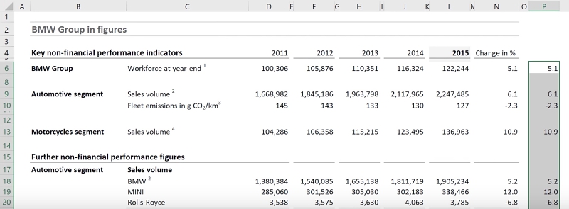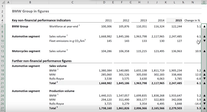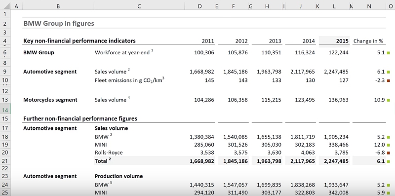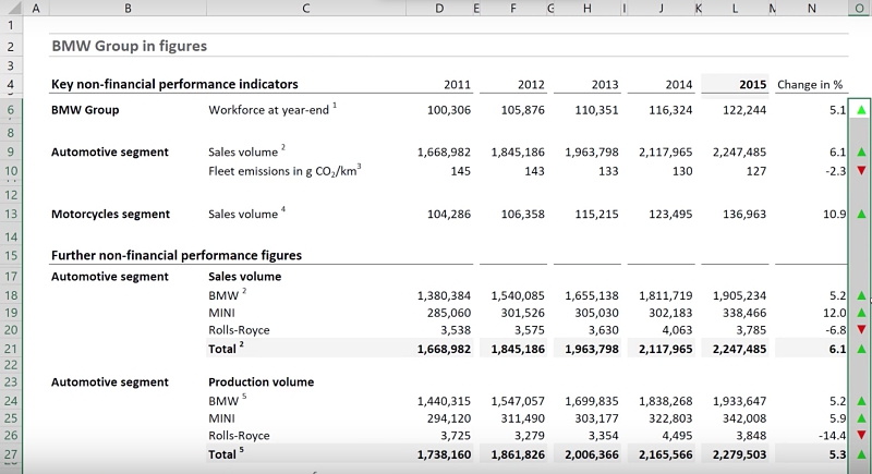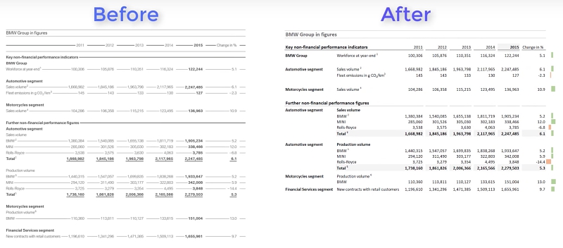 Here is a before and after comparison of the tables. The latter brings some color to the report and makes the report easier to read. It directs your attention to the positive and negative changes.