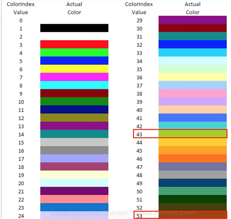 For this example, use color #43 for the positive value and color #53 for the negative value. Highlight the cells in column O and go to Format Cells (CTRL + 1). Instead of using [green] and [red], replace it with the color code: