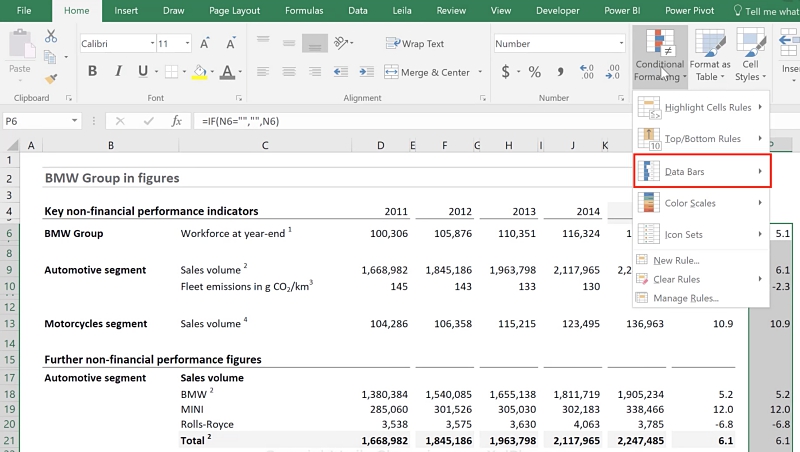 Conditional formatting is used to add data bars to the table. To start, add a new column that contains the values of the cells you want to use. In this example, we want to visually present the increase and decrease % (column N). Do this by using direct cell references to column N, and setup the formula where it shows as blank when there is no value in column N.