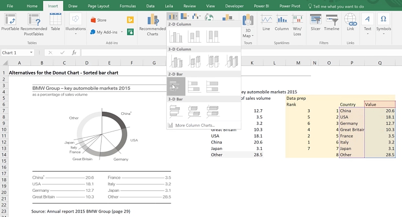 To create a sorted bar chart of this data, one option would be to highlight cells J7:L13, manually sort it and then create a bar chart.