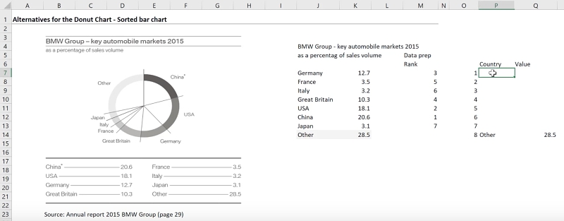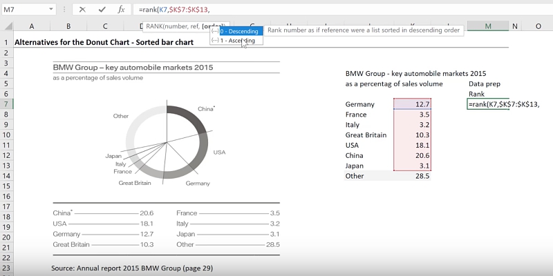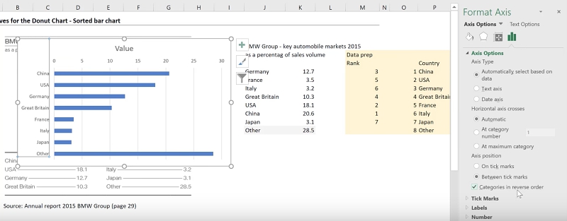 By default, Excel sorts the categories from bottom to top, with Other showing at the top and rank 1 at the bottom.