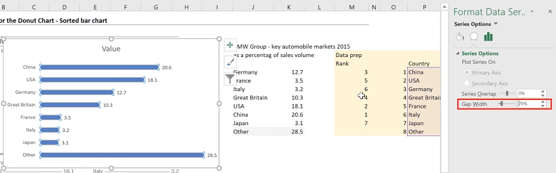 For this example, decrease the gap width to 70% at the Format Data Series panel.
