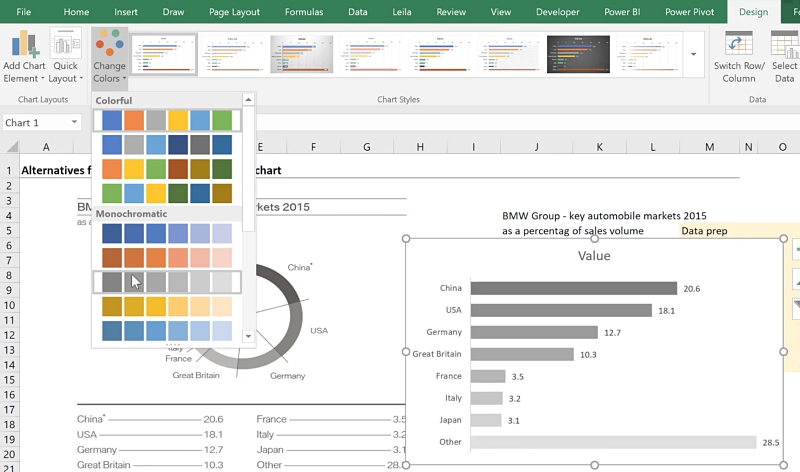 - Select the chart and go to the Design, then click on Change Colors. You will notice that there are monochromatic options for each color in the current theme. Select the gray scheme.