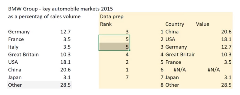 For ranks 1 to 7, we will use the Index Match approach to display the country and value. (Here is the link to the Index Match walkthrough.)