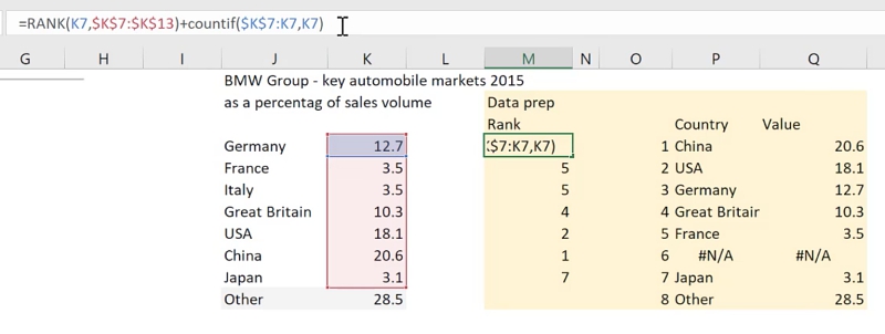 Cell M7 = RANK(K7,$K$7:$K$13)+COUNTIF($K$7:K7,K7)-1Drag this formula down and you will see that France is ranked 5 and Italy is ranked 6. This is because 3.5 has occurred twice until now, so it adds 2 to the original rank and then subtracts 1 so that we get a unique rank.
