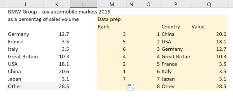 Highlight the country and value cells in the data prep table (cells P6:Q14).