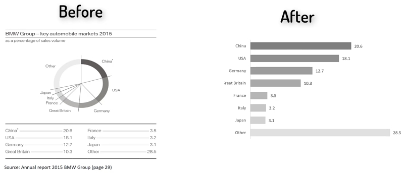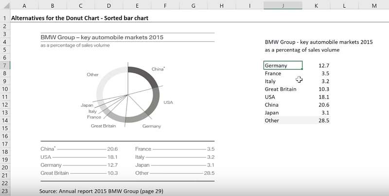You can easily compare the size of each country and see its value right beside it, whereas for the doughnut chart you had to think how much bigger China is in comparison to the USA, and then look down the table to find the corresponding value.