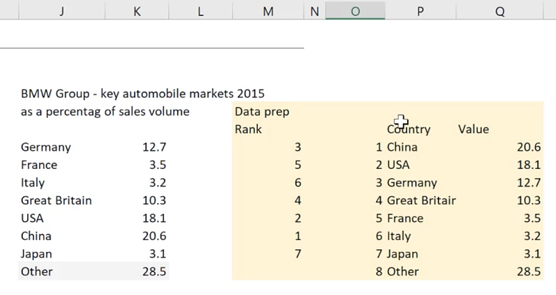 This will be used as the reference to display the country corresponding to the rank number in column O and the corresponding value in column P.