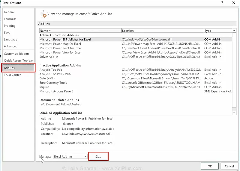 - Manage Add-ins: At the bottom of this window, find the “Manage” box. Select “Excel Add-ins” and click “Go”.
