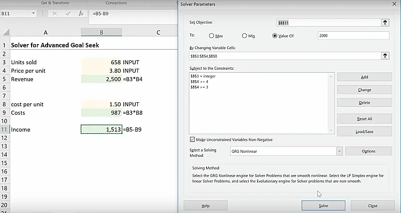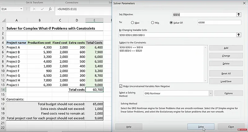 - Choose Solving Method: Select the appropriate solving method (e.g., GRG Nonlinear).
